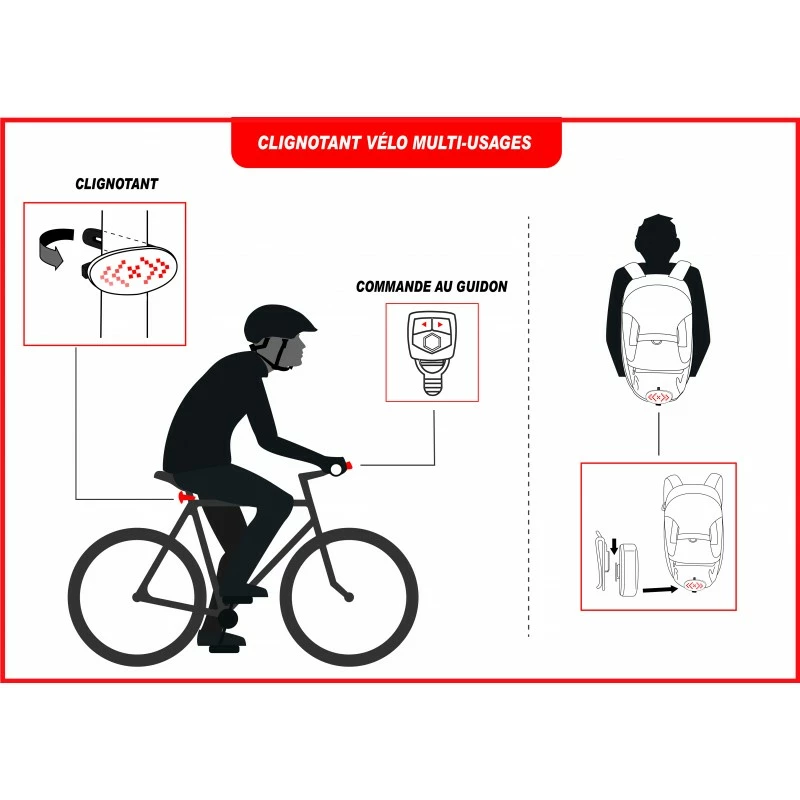 Le clignotant pour vélo allie des clignotants et un feu arrière, il se commande grâce à un boiter fixé sur le guidon.